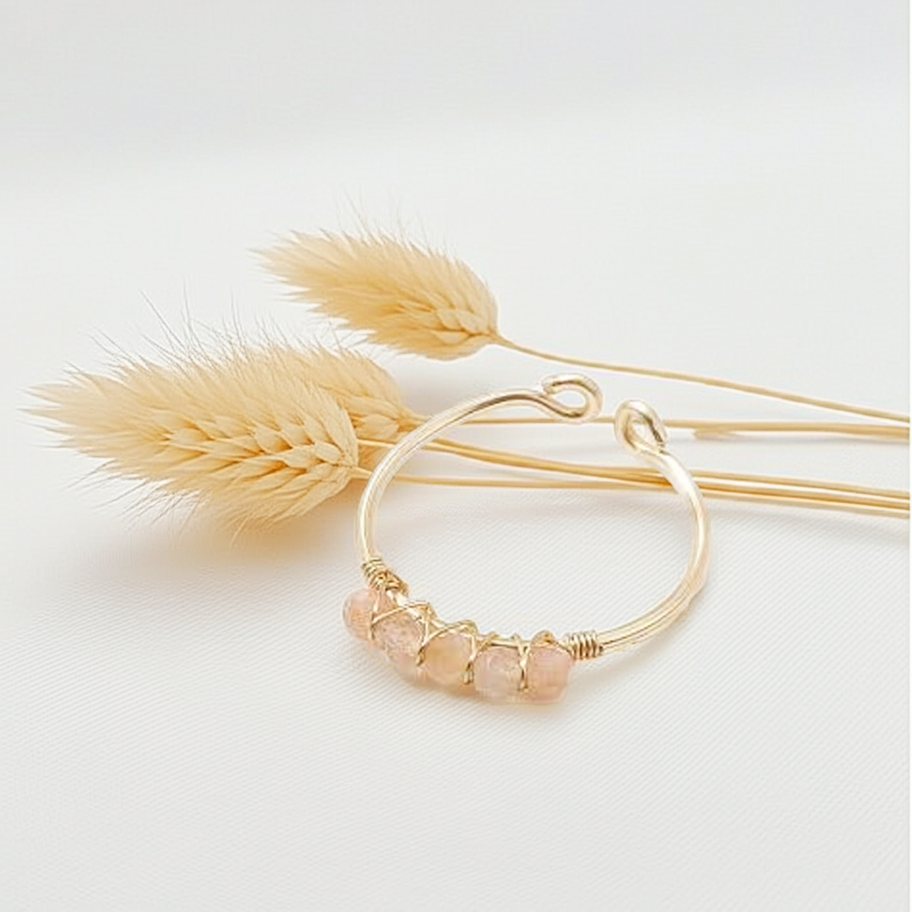 Este anillo de Piedra Sol está creado con delicadas cuentas de 4 mm montadas sobre hilo de cobre con baño de oro. Su diseño ajustable (diámetro interior de 18 mm) lo convierte en una pieza cómoda y versátil, perfecta para acompañarte cada día.