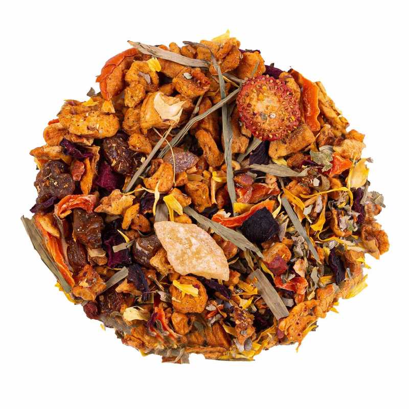 Ingredientes: Manzana, uva pasa (uva, aceite vegetal), piña (piña, azúcar), remolacha, zanahoria, melocotón (melocotón, harina de arroz) (6%), aroma natural, hojas de mora, hojas de bambú, fresa (2%), caléndula.