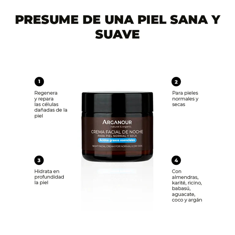 Porque es mucho más que una hidratante: esta es tu arma secreta antiedad mientras duermes. Si buscas una crema de noche natural, eficaz y segura, esta es la más potente de la línea Arganour para pieles normales y secas.