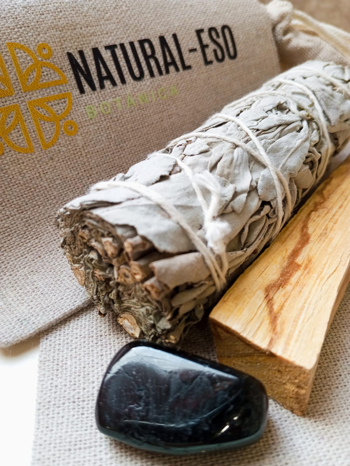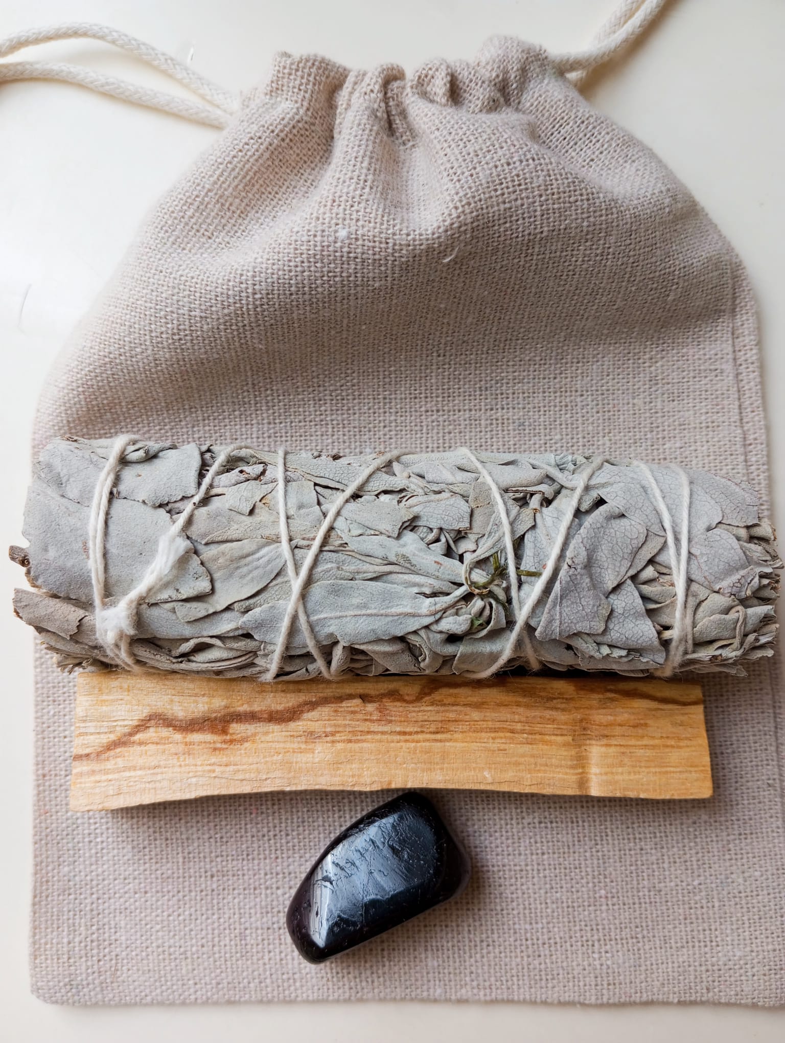 Este set incluye una bolsita de lino , perfecta para llevar contigo; una vara de palo santo de origen sostenible para limpiar energéticamente tus espacios; un atado de salvia blanca , conocida por sus propiedades purificadoras y una turmalina negra , poderosa piedra protectora que absorbe las energías negativas.