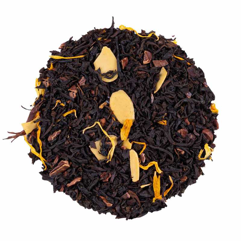 Ingredientes: Té negro Ceylon, -Sudíndico, -China, trozos de cacao, pera (pera, harina de arroz) (7%), aroma, ALMENDRA (4%), botón de rosa, caléndula.