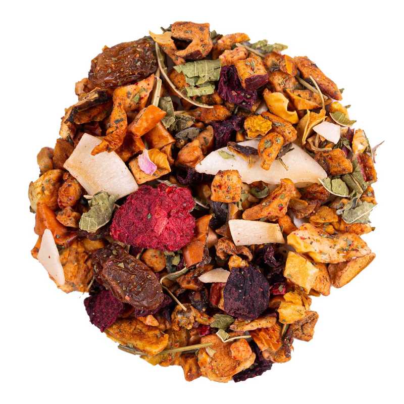 Ingredientes: Manzana, uva pasa (uva, aceite vegetal), coco (coco, graso de coco, azúcar), mango (mango, azúcar), verbena entera, remolacha, aroma natural, aronia, fresa, botón de rosa, frambuesa, vainilla.